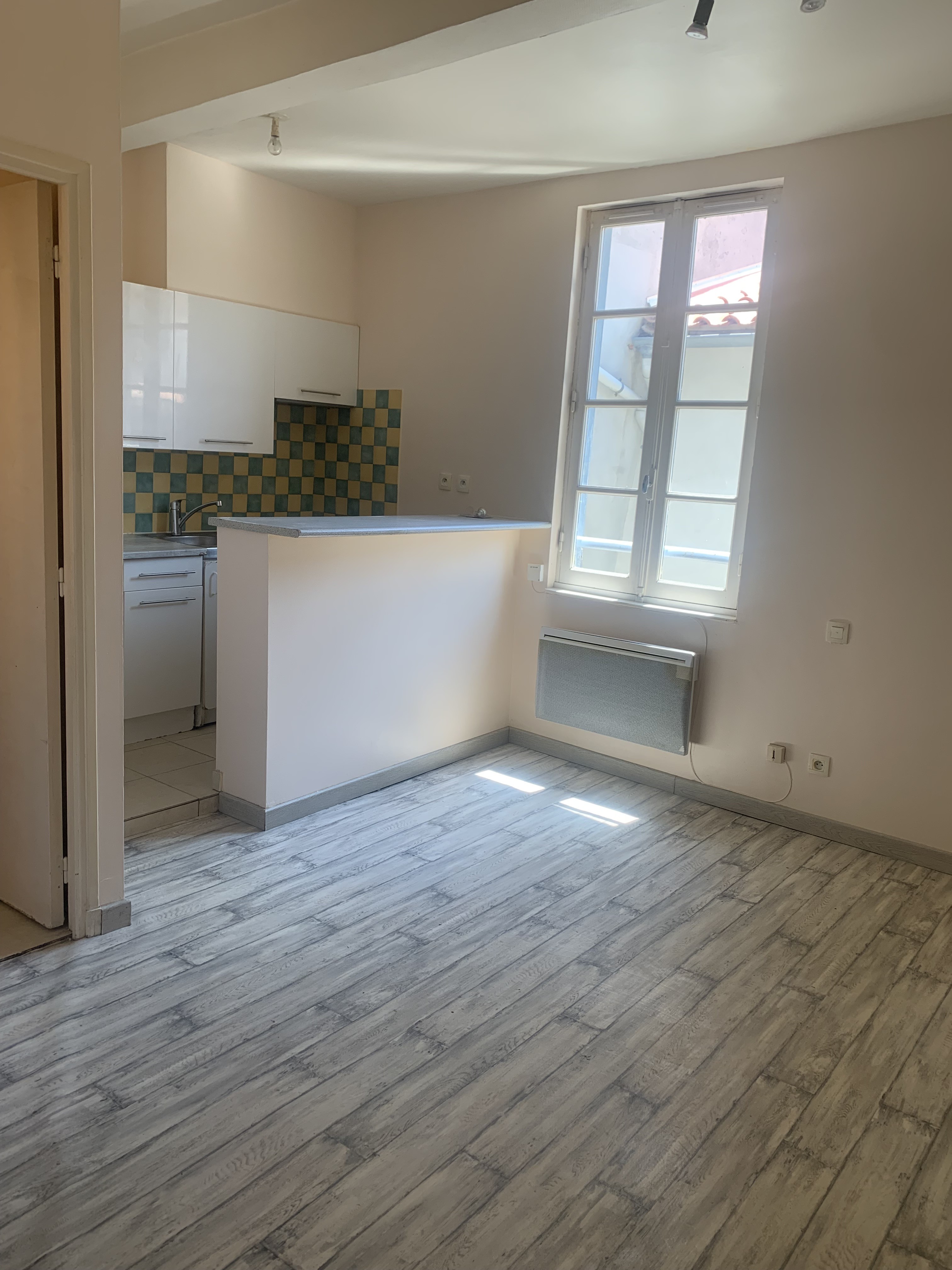 Studio au 1er étage d'un immeuble situé dans le centre de Revel comprenant pièce de vie avec cuisine aménagée ; salle d'eau, wc.